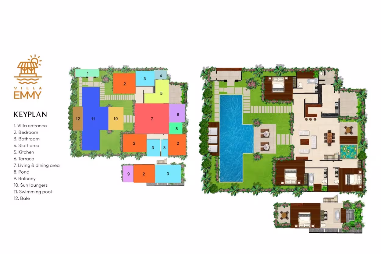 Die Villa Emmy ist eine außergewöhnliche Residenz mit vier Schlafzimmern, deren offene Wohn- und Essbereiche einen traumhaften Blick auf den großen rechteckigen Swimmingpool und das traditionelle Balé bieten.