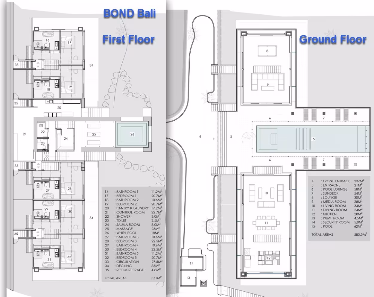BOND Bali cuenta con cinco dormitorios elegantemente diseñados, cada uno con vistas panorámicas a la selva a través de ventanales de piso a techo. Los interiores minimalistas combinan la comodidad moderna con la belleza natural. Las camas king-size, vestidas con sábanas de alta calidad, garantizan un descanso reparador, mientras que algunas habitaciones ofrecen balcones privados o acceso directo a la piscina para despertar en completa serenidad. Cada baño en suite es un santuario privado de spa, con duchas tipo lluvia, bañeras profundas y elegantes acabados en piedra. Algunos incluyen duchas tropicales al aire libre, permitiendo a los huéspedes sumergirse en la naturaleza. Amenidades de lujo cuidadosamente seleccionadas, toallas suaves y productos de aseo orgánicos completan la experiencia.