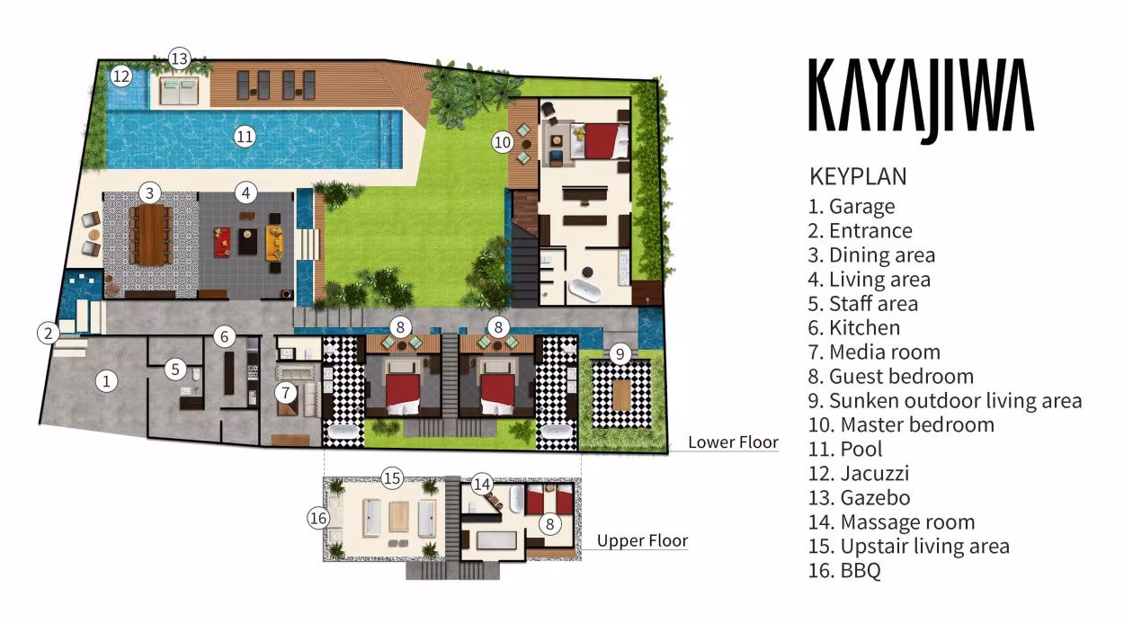 Villa Kayajiwa representa el equilibrio perfecto entre el yin y el yang. Nada más salir de tu habitación, cruzas un pequeño estanque, un detalle que llena todo el espacio exterior con el relajante sonido del agua fluyendo. Pero la villa también cuenta con su propia sala de karaoke diseñada a medida, que garantiza horas interminables de diversión.