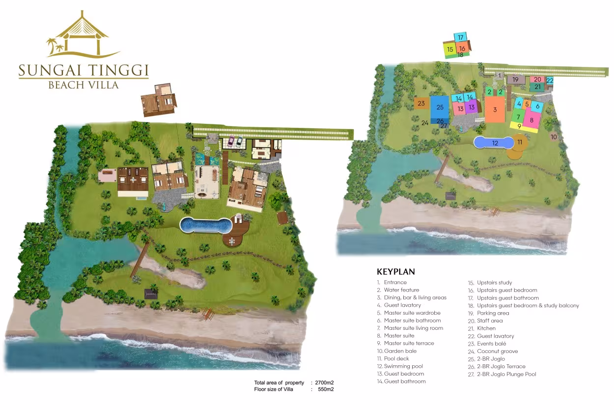 La Villa Sungai Tinggi Beach ha sido diseñada para aprovechar al máximo su ubicación privilegiada frente al mar y las impresionantes vistas del océano. Un amplio pabellón de estar abierto, inspirado en un tradicional wantilan balinés (sala de reuniones del pueblo), es el centro social de la villa. A un lado se encuentra el pabellón del dormitorio principal con un salón privado. En el otro extremo, un edificio de dos plantas alberga tres dormitorios para huéspedes y, junto a este, se encuentra la encantadora casa de huéspedes Joglo de dos dormitorios con su propia cocina y comedor privado. Detrás de los pabellones principales de estar y comedor, se encuentra la cocina del chef y el área de servicio del personal. En los exuberantes jardines se encuentran la piscina de 18 metros, una terraza para tomar el sol y un bosque privado de cocoteros, que incluye un gran balé de eventos, ideal para bodas y celebraciones.