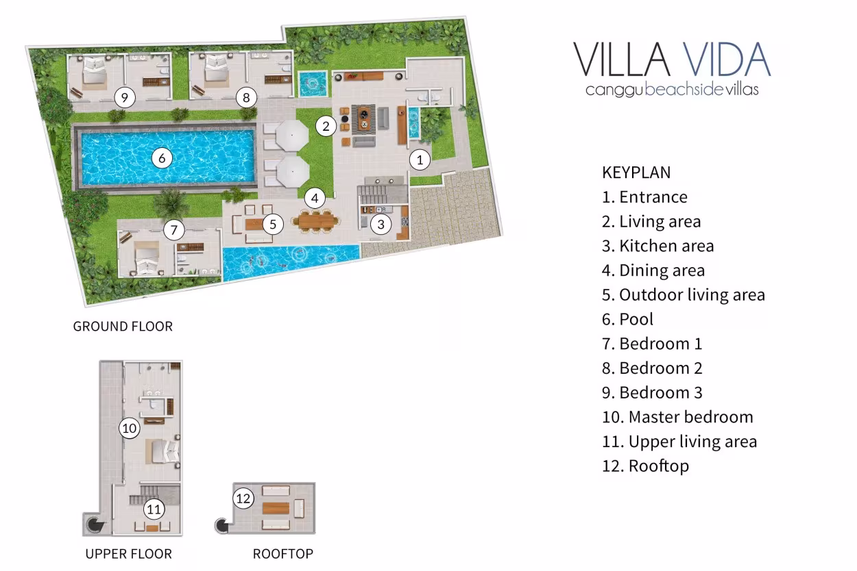 Villa Vida is built in a U-shape around a beautiful tropical garden and swimming pool. Beyond the villa’s private entrance is a spacious lounge, a well-equipped kitchen and a guest washroom. A staircase from the lounge goes up to the first floor with its master bedroom and large terrace. A second staircase leads to the roof terrace. Beyond the lounge to the left is a beautiful outdoor dining and seating area, along with one of the guest bedrooms. The other two guest bedrooms are on the right-hand side of the pool, separated from each other by a small patio garden.