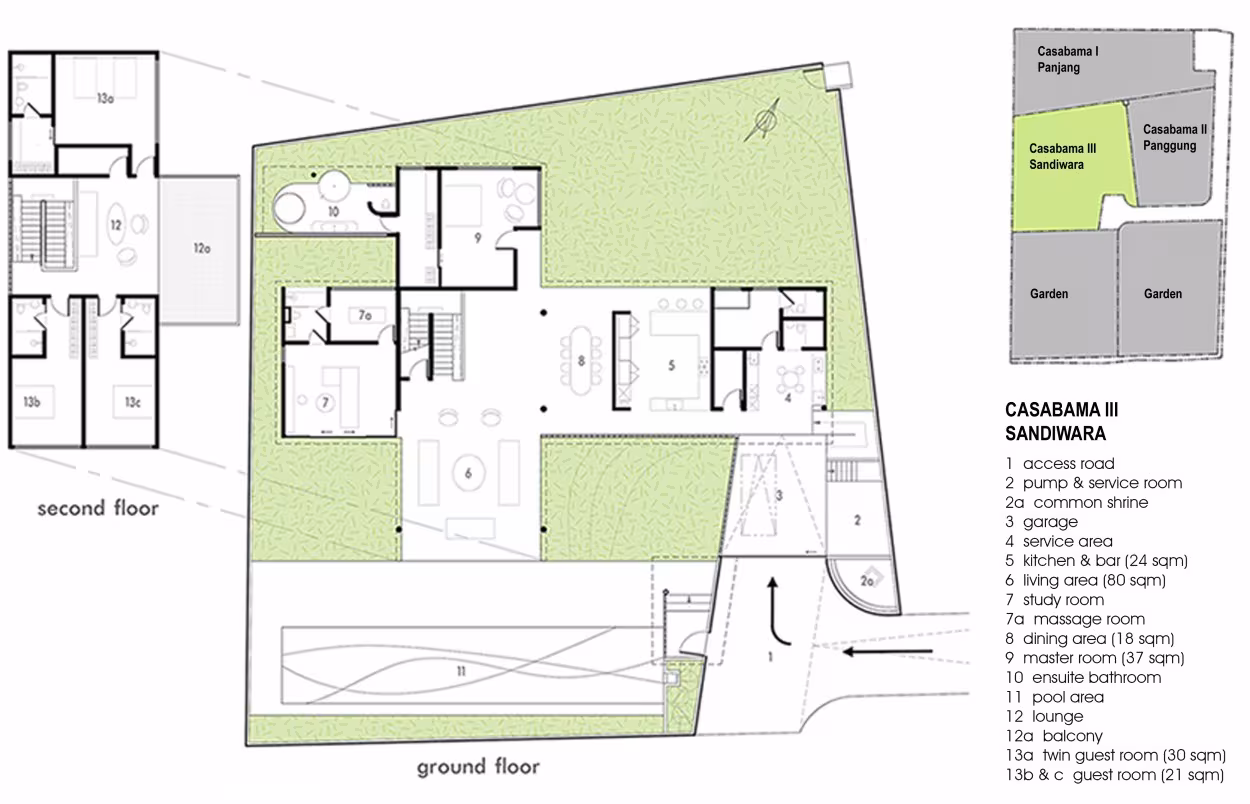 Inspirée des villages traditionnels balinais, la villa intègre des éléments d’architecture locale associés à un design moderne original, un style raffiné et une attention particulière au confort. La Villa Casabama III Sandiwara est entièrement autonome avec une entrée privée, un terrain indépendant, un garage et une piscine, mais reste facilement accessible via un portail commun si nécessaire. Un gymnase bien équipé et une salle de yoga, situés à l’entrée du domaine, sont partagés par les trois villas du complexe. Entre les villas et l’océan s’étend une magnifique cocoteraie verdoyante, parfaite pour des mariages romantiques et des événements spéciaux.